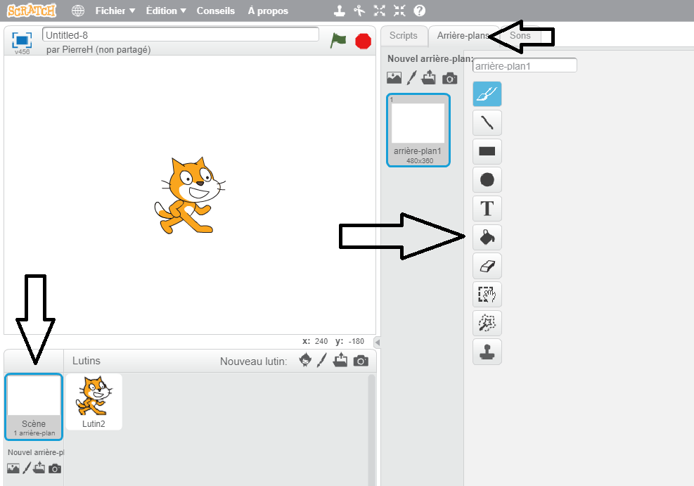Créer un nouveau projet Scratch et sélectionner la scène (en bas à gauche) puis l'onglet Arrière-plan.