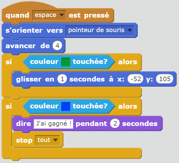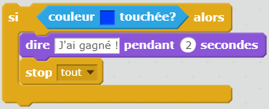 - A l’intérieur utilisez un bloc qui affiche « j’ai gagné » puis ajouter un bloc "stop tout".