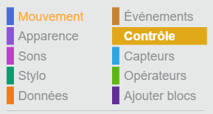 - Beige pur les blocs de contrôle, qui permettent de modifier le déroulement de la suite du programme.