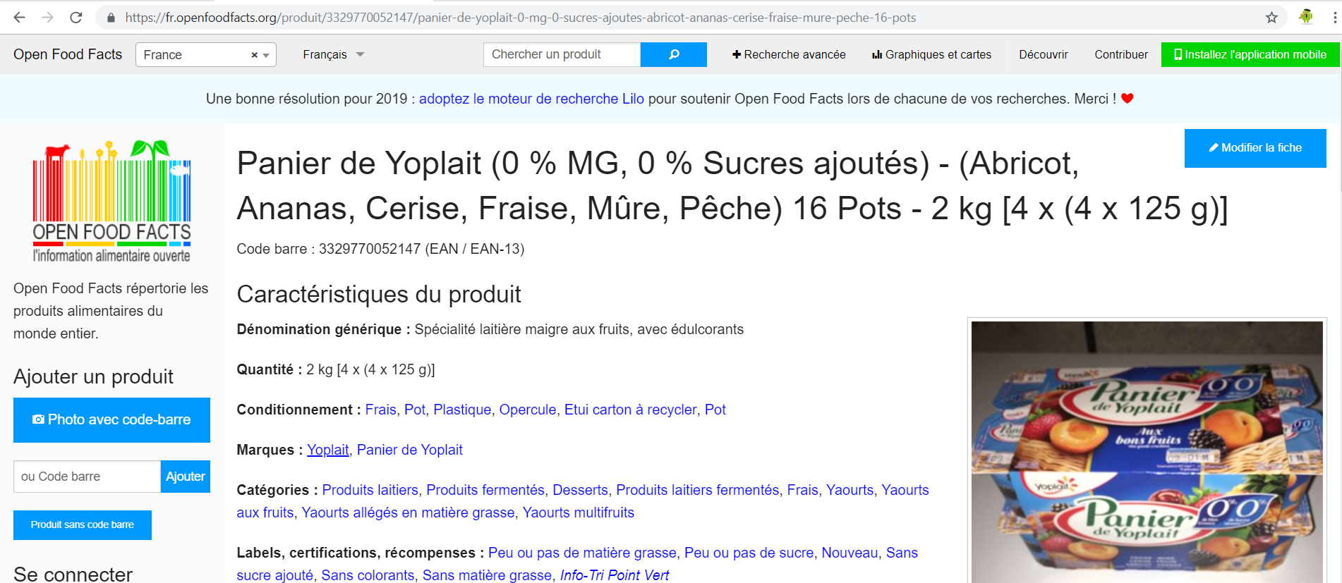 Open food facts renvoie les caractéristqieus d'un produit partir de son code barre, par exemple pour le code :3329770052147 https://fr.openfoodfacts.org/produit/3329770052147