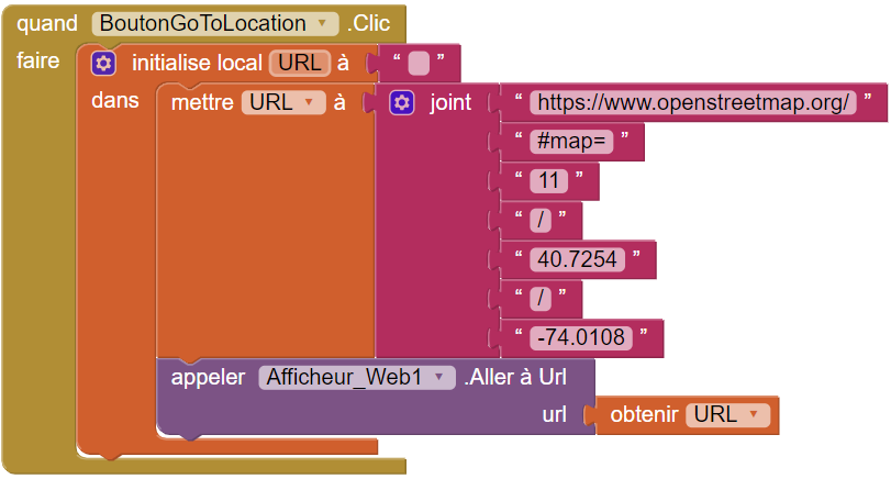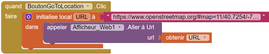 Puis Passez à la programmation des blocs.- Initialisez une variable globale URL avec une adresse internet valdie pour open street map (copier/coller), ou plutôt - c'est encore mieux - initialisez une variable locale URL dans le script du bouton : quand boutonGoToURL