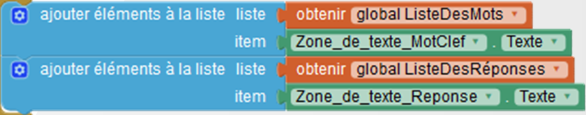 Dans cette 3° version de l'application, allez utiliser les blocs de manpulation des listes pour ajouter ou supprimer des mots clefs et des réponses dans les listes. |